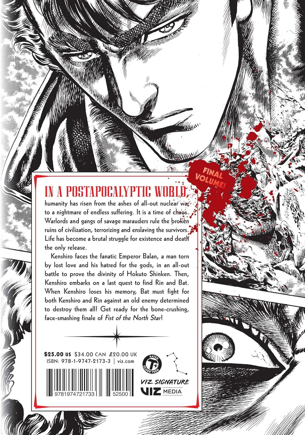 Kenshiro faces the fanatic Emperor Balan, a man torn by lost love and his hatred for the gods, in an all-out battle to prove the divinity of Hokuto Shinken. Then, Kenshiro embarks on a last quest to find Rin and Bat. When Kenshiro loses his memory, Bat must fight for both Kenshiro and Rin against an old enemy determined to destroy them all! Get ready for the bone-crushing, face-smashing finale of Fist of the North Star!