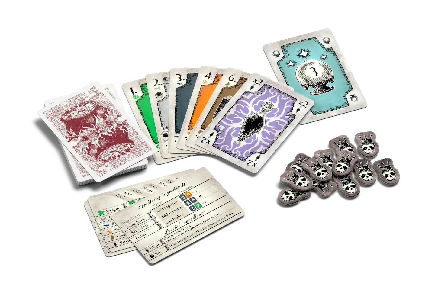 The Lead Witch plays two cards (one face down), while the two Lesser Witches combine one card each. Two ingredients of the same rank or suit get added together, leading to tricky situations!
