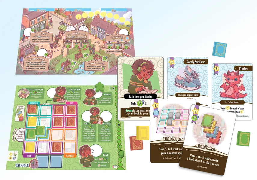 A Place for All My Books is a puzzley book gathering, sorting, and organizing game in which players arrange stacks of books in different rooms of their apartment as personal projects. When done, they can admire their accomplishments and gain their rewards – not least of which is renewed energy, which they can then spend to head out into the village - to pick up more books!