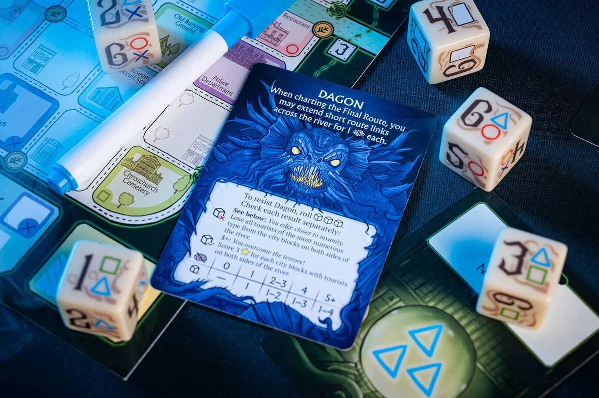 Your goal is to create a route with as many tourists and landmarks of different types as possible, because they score you victory points. Before the end of the game, you will be confronted by one of the Old Ones: Cthulhu, Yog-Sothoth, Dagon or Shub-Niggurath. Depending on how well you avoided Horrible places and used special abilities provided by otherworldly creatures, you either gain rewards or lose tourists.