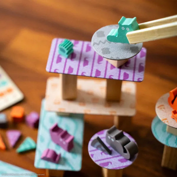 In Cats Knocking Things Off Ledges, players take turns building a wobbly tower of platforms, placing their cats, and batting toys off the edge to score points based on how far they fall. But watch out - if the tower tumbles, you score zero! Earn extra points by landing on specific platforms, and race to be the first to reach the highest score.
