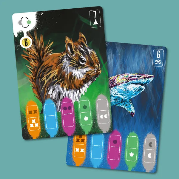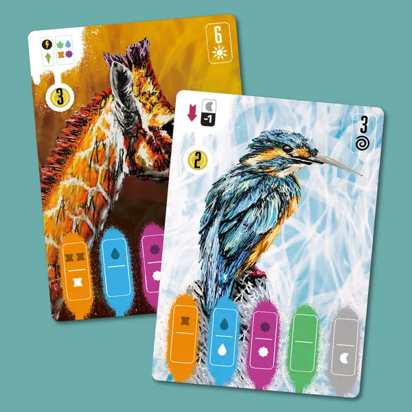 Coexist centers on open-drafting and resource-management mechanisms. Releasing animals into the wild earns you points and unlocks special skills, but you need to recognize your limits and avoid overestimating your team's capabilities. The first player to release five species into the wild triggers the game end, then the player with the most points wins.