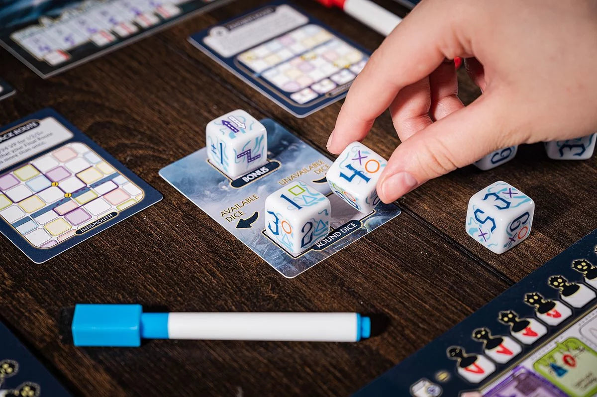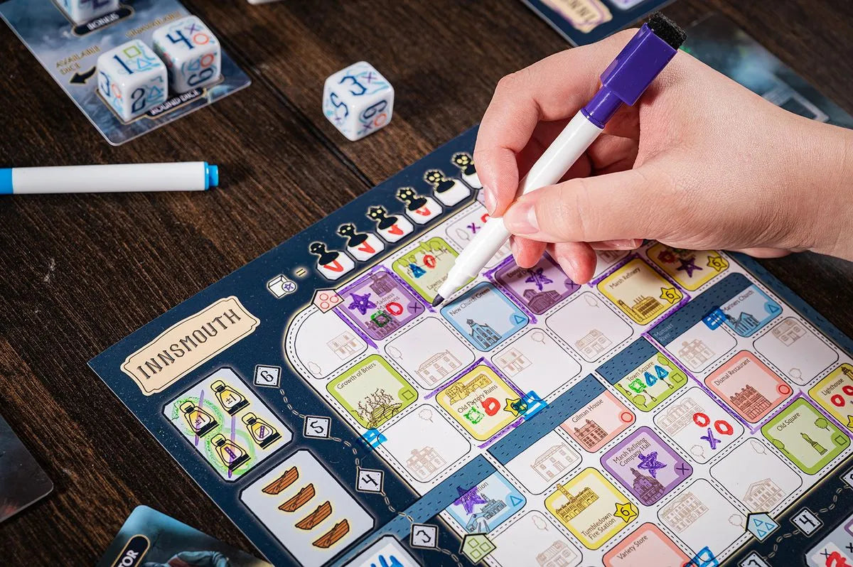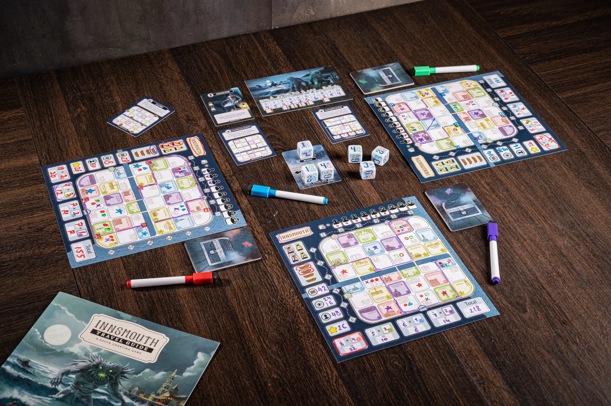 In Innsmouth Travel Guide, you play as a bold (or perhaps reckless) tour guide charting the eeriest sightseeing route imaginable. Tourists are eager to see the town’s haunted landmarks — but cultists and Deep Ones prowl the shadows, ready to snatch them away. Balancing risk and reward is key: the more you expose your group, the more points you might score… or lose. Innsmouth Travel Guide follows Arkham in an innovative roll-and-write series inspired by En Route.