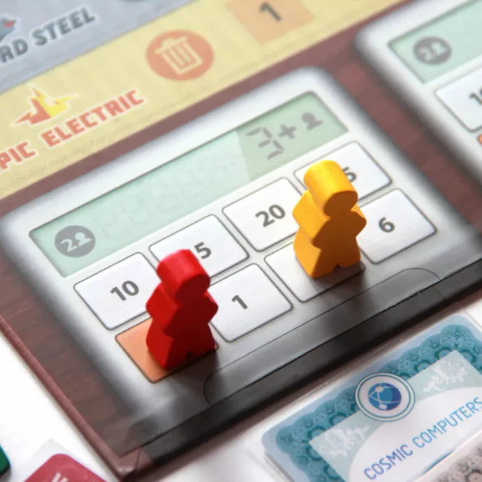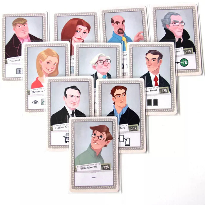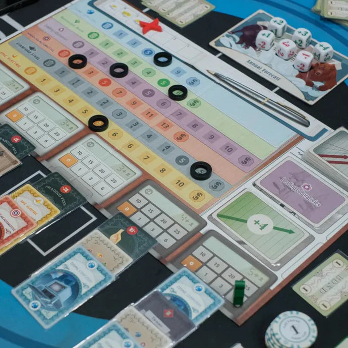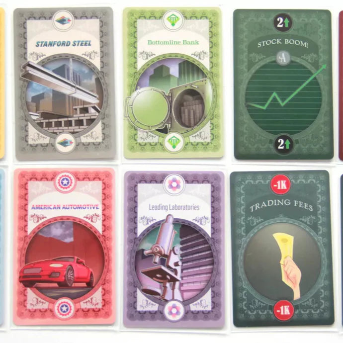 Both of these mechanisms are combined with some stock market elements to make players consider multiple factors when selling a stock. Do you hold onto a stock in hopes of catching a lucrative stock split or do you sell now to avoid the potential company bankruptcy? Can you hold onto your stock until the end of the game to become the majority shareholder, or do you need the liquidity of cash now for future bidding? Do you risk it all by investing heavily into one company, or do you mitigate your risk by diversifying your portfolio?