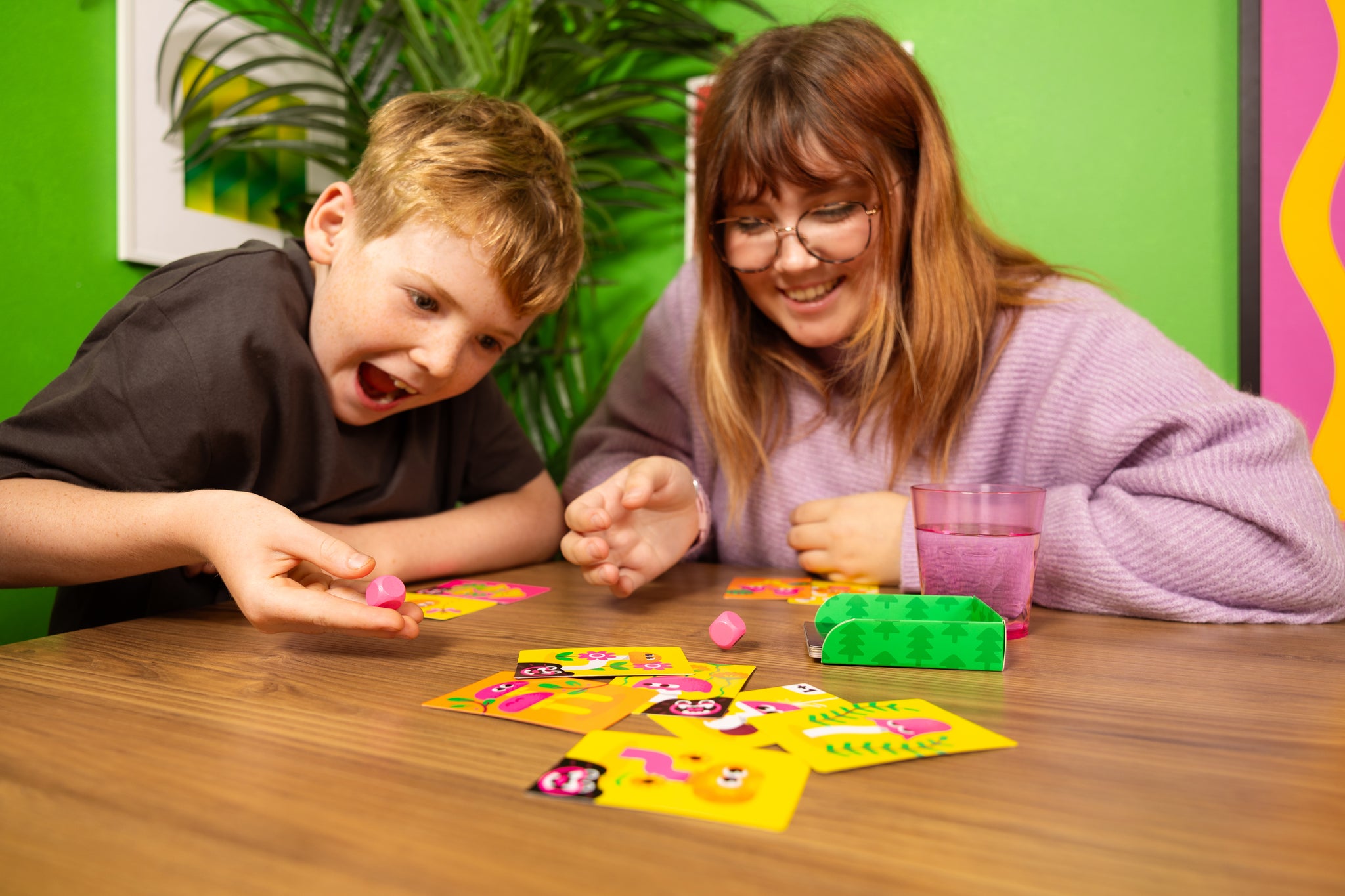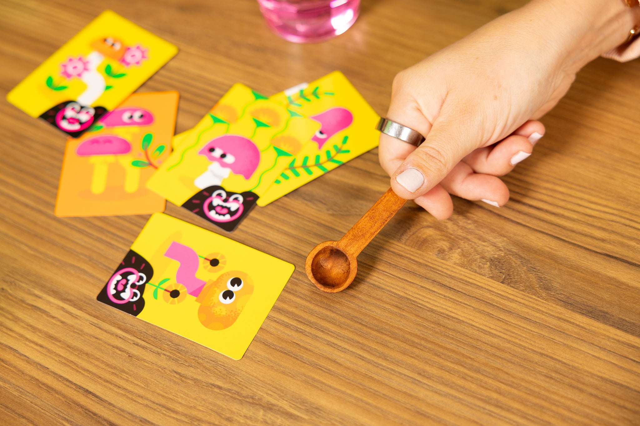 A card game meets a treasure hunt. An active game that gets everyone involved in chanting chasing spoons and hunting mushrooms.