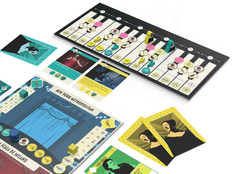 The game ends when five operas have been performed. At that point, the points earned in the theaters, the orchestra, the piano, and the timeline are tallied to determine who has left the most indelible mark on the history of opera.