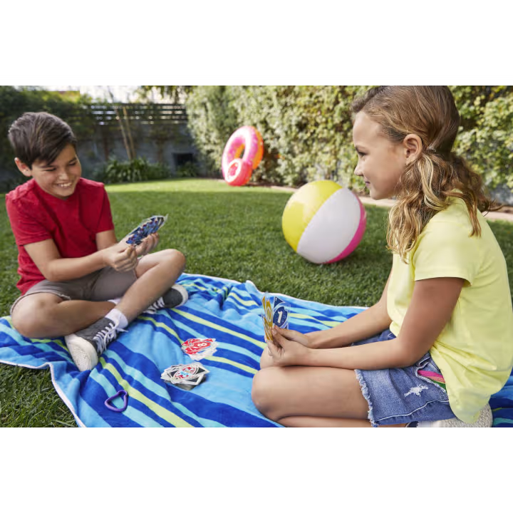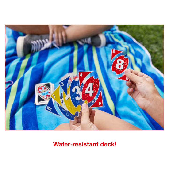 Take this rugged version of UNO on all your travels! The durable plastic cards resist water so you can enjoy Fast Fun for Everyone! anywhere-even outdoors. UNO H2O To Go also comes with a handy clip that keeps all the cards together and attaches easily to a beach bag, backpack, or camping gear. You'll be ready to play UNO wherever you wane, whenever you want! Play classic UNO or mix it up by playing two-handed, partner, and tournament options for even more action! Contains 108 UNO H2O To Go cards. Ages 7 and older.