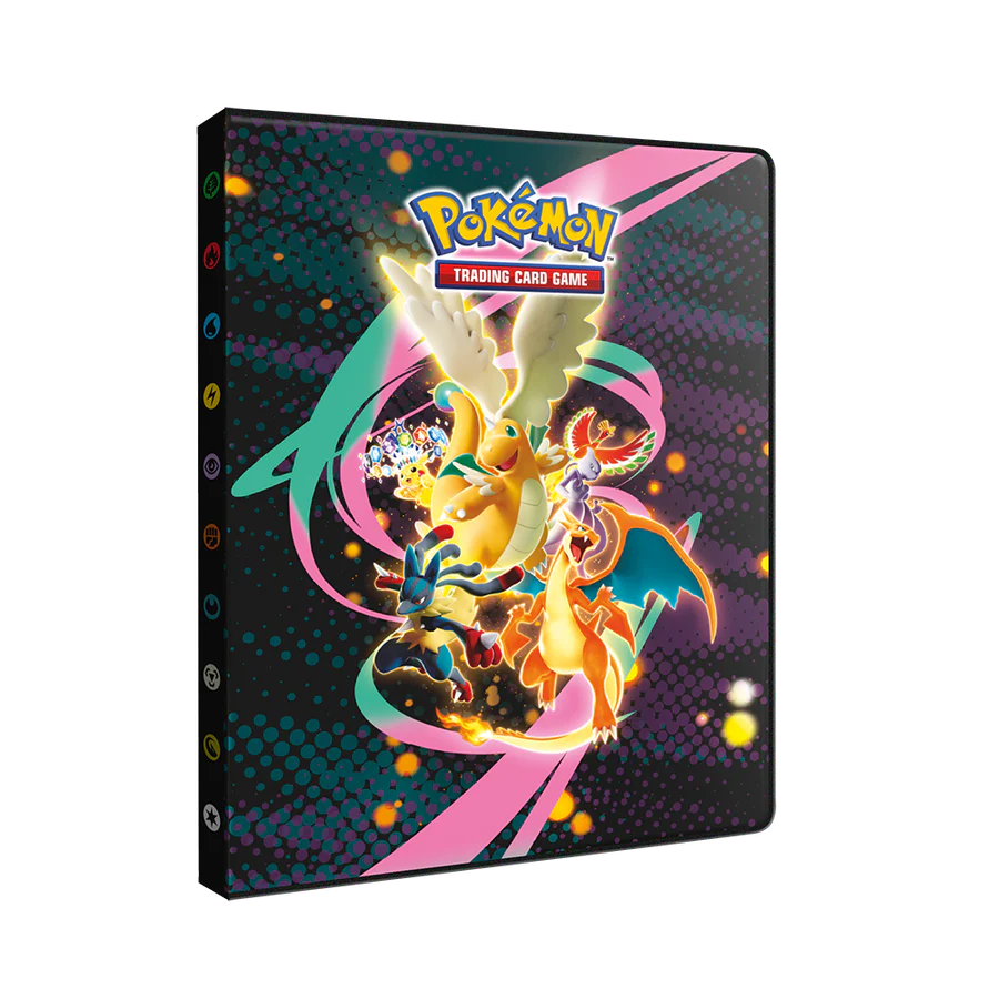 9-Pocket Portfolios for Pokémon feature a vibrant, full-art cover of Mega Dragonite, Mega Charizard, Mega Lucario, Mewtwo, Ho-Oh, and Stellar-type Terastallized Pikachu. Each portfolio stores and protects up to 126 standard size cards single-loaded and 252 cards double-loaded in archival-safe pages. Made in California, U.S.A.
