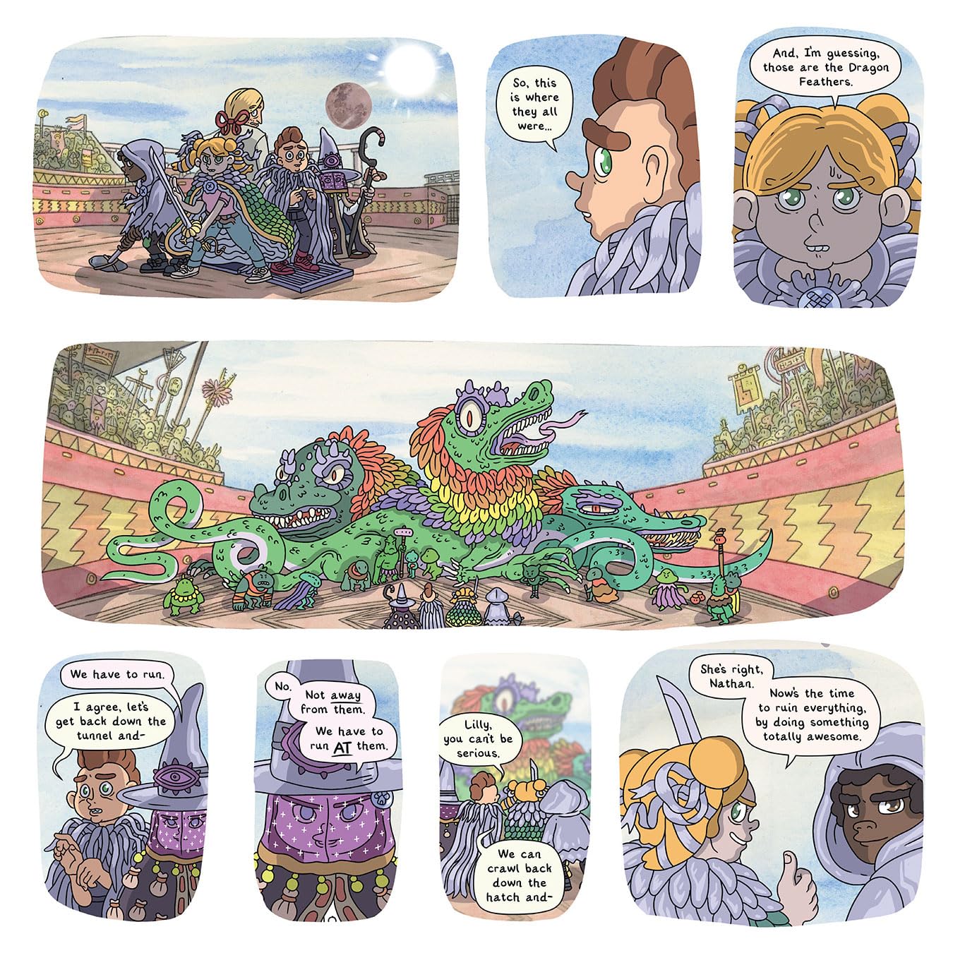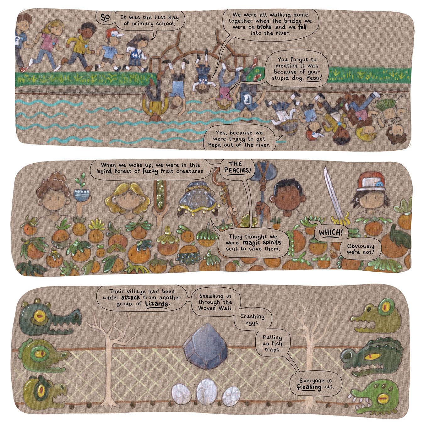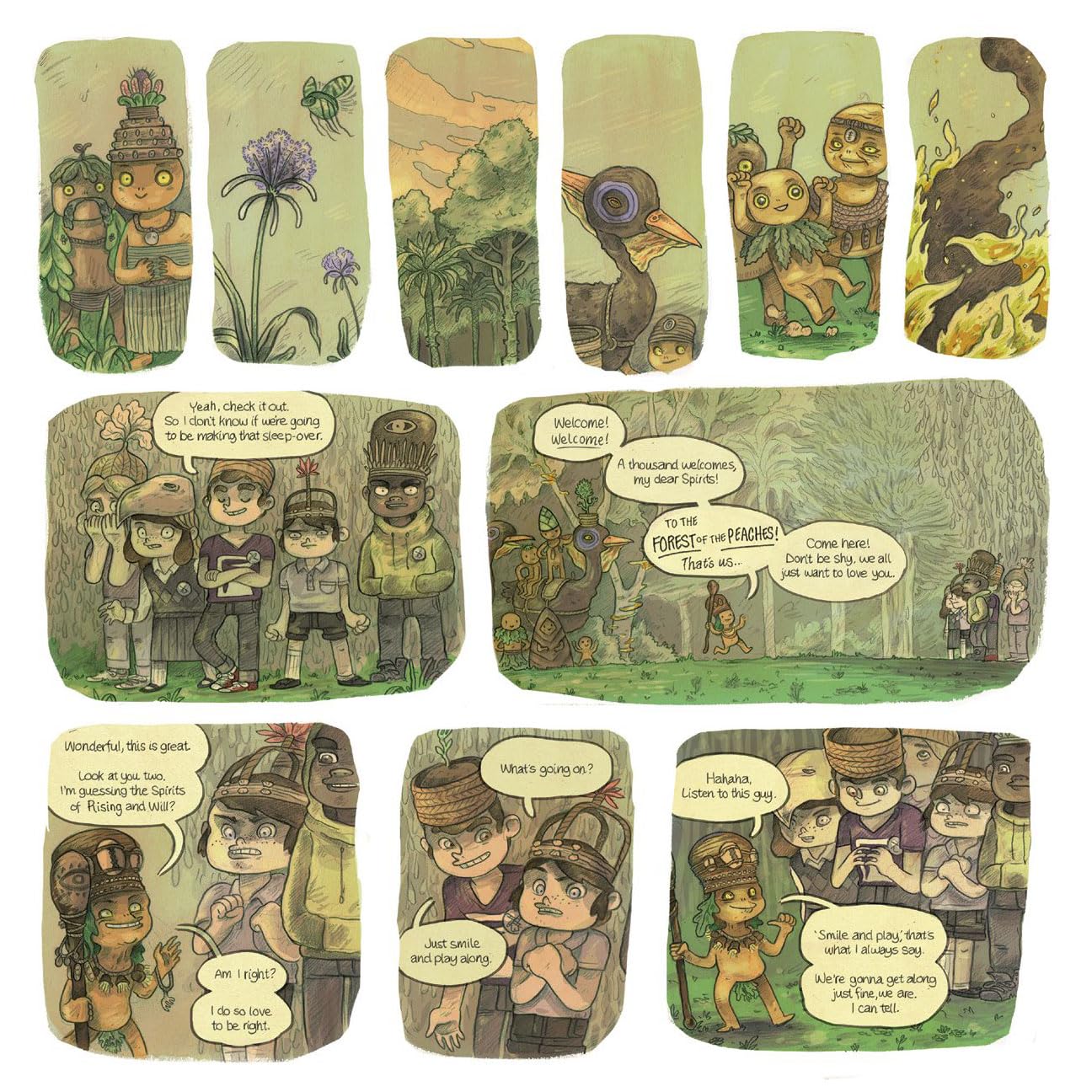 But their plans for sleepovers, fantasy games, and romance are thrown out the window when the whole gang falls into a river and wakes up in a village of fantastic creatures. Hailed as magical spirits, threatened by lizards, and trained in the mysterious arts of tea-brewing, these kids must find their way home—if they don’t throttle each other first.
