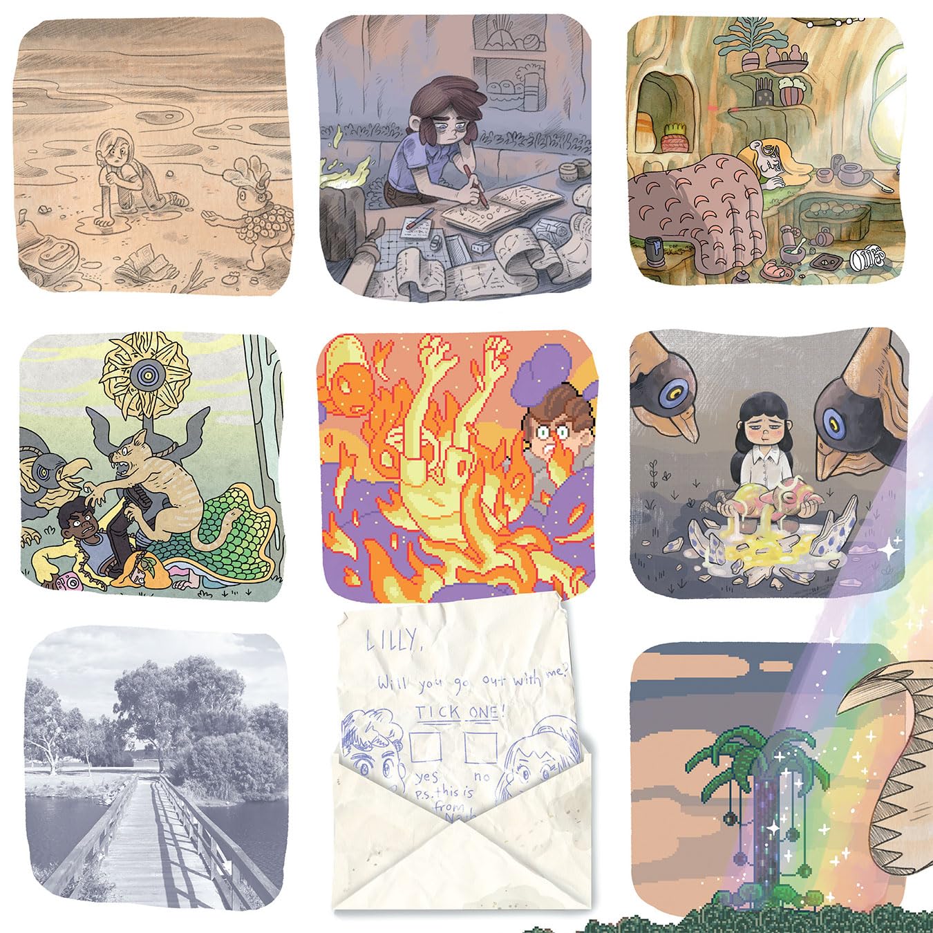 Featuring a kaleidoscope of art styles, a puzzle-box narrative structure, and a spectacular reimagining of his childhood hometown, Campbell Whyte’s astonishing Australian fantasy series is now collected in one volume for the first time.