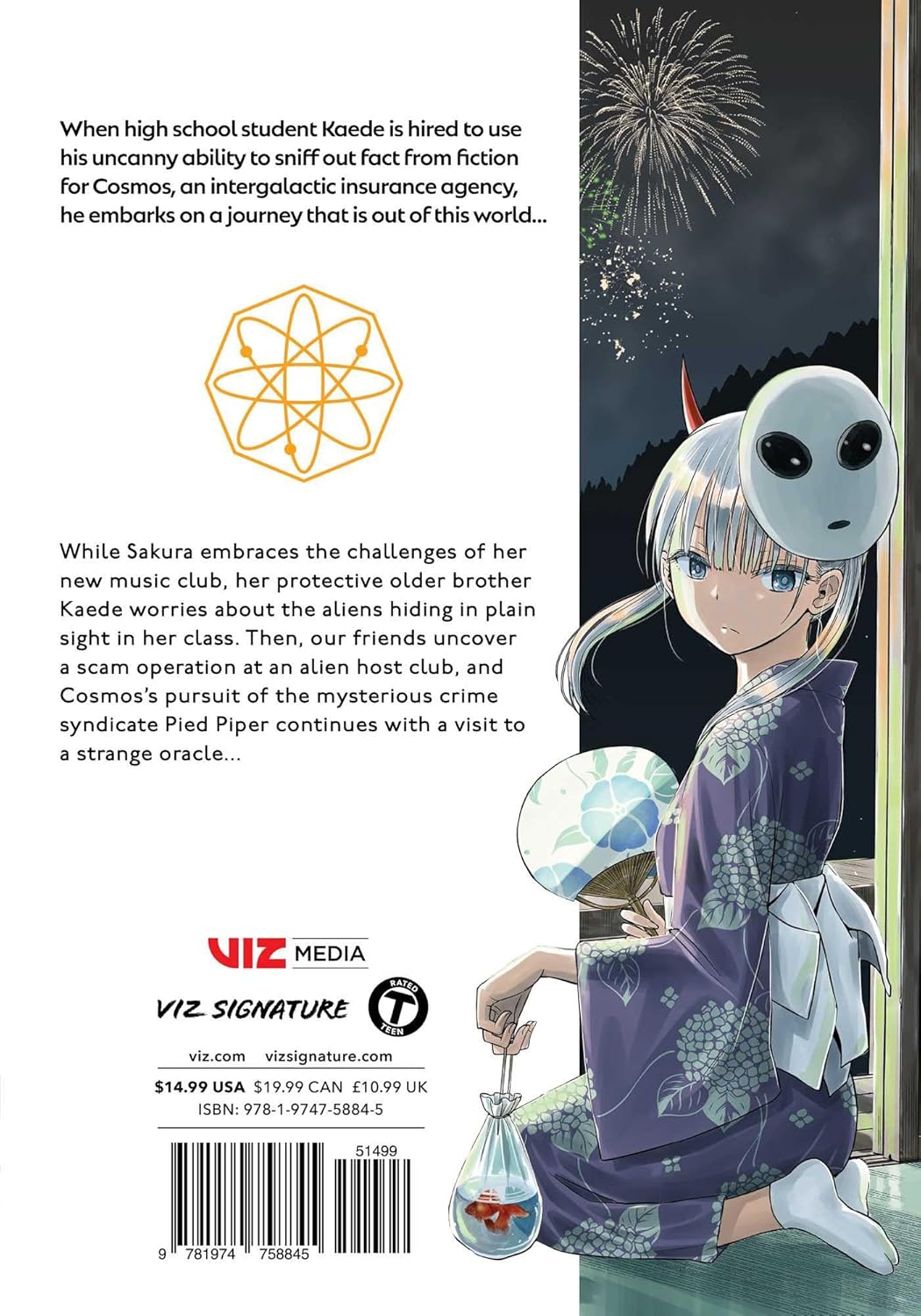 While Sakura embraces the challenges of her new music club, her protective older brother Kaede worries about the aliens hiding in plain sight in her class. Then, our friends uncover a scam operation at an alien host club, and Cosmos’s pursuit of the mysterious crime syndicate Pied Piper continues with a visit to a strange oracle…