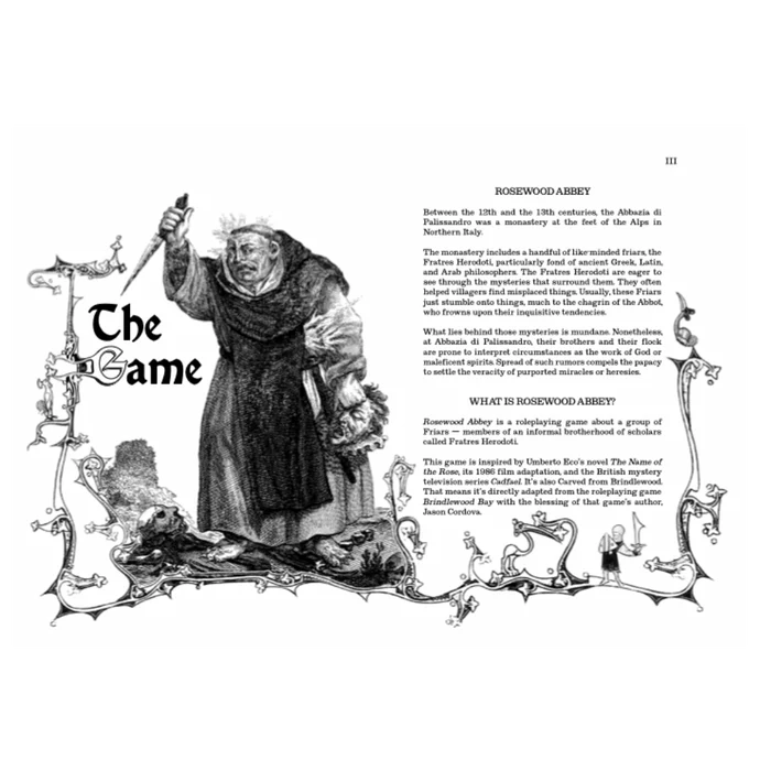 The Fratres Herodoti comprise an informal brotherhood of scholars who swore an oath to knowledge and truth. The mysteries these Friars, the player characters, investigate are often mundane and unrelated to one another.