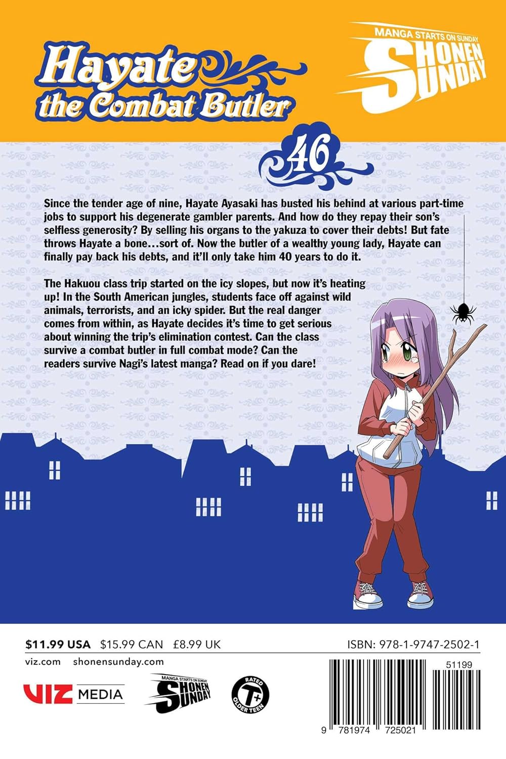The Hakuou class trip started on the icy slopes, but now it’s heating up! In the South American jungles, students face off against wild animals, terrorists, and an icky spider. But the real danger comes from within, as Hayate decides it’s time to get serious about winning the trip’s elimination contest. Can the class survive a combat butler in full combat mode? Can the readers survive Nagi’s latest manga? Read on if you dare!
