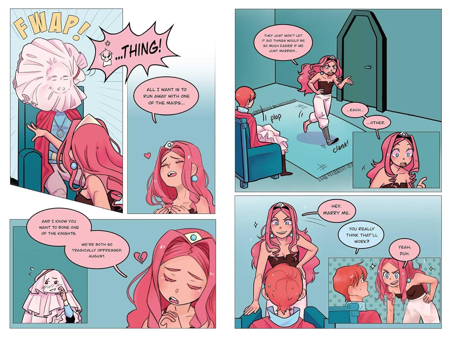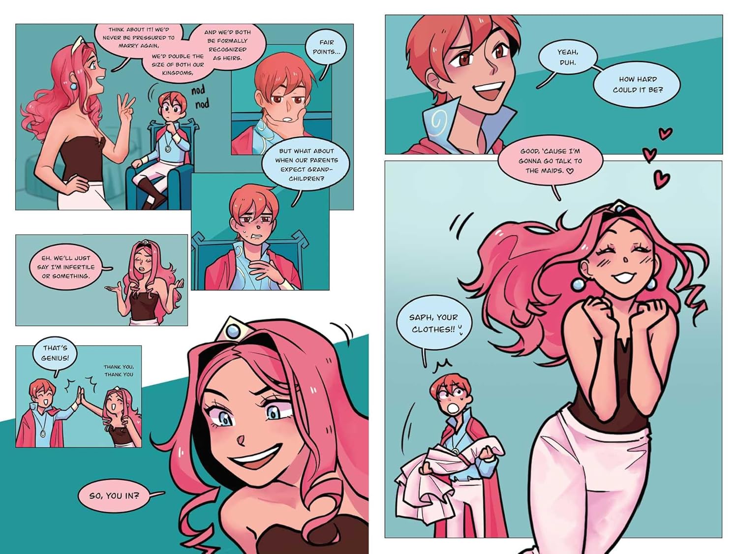 Princess Sapphia is decidedly not into princes, or any boys for that matter. So when her parents begin to push her to marriage, she quickly enlists her equally gay best friend to organize a sham marriage, navigate life and love, and hopefully get the girl, in High-Class Homos.