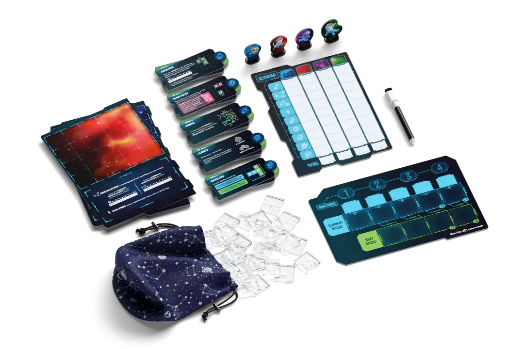 Draft clickity-clackity, transparent tiles to fill your star chart and explore the universe. You'll connect Constellations, build belts of Asteroids, and study your Satellites with the game's modular scoring system. Be careful of those pesky Black Holes—that is, unless you've got the perfect place to put them!