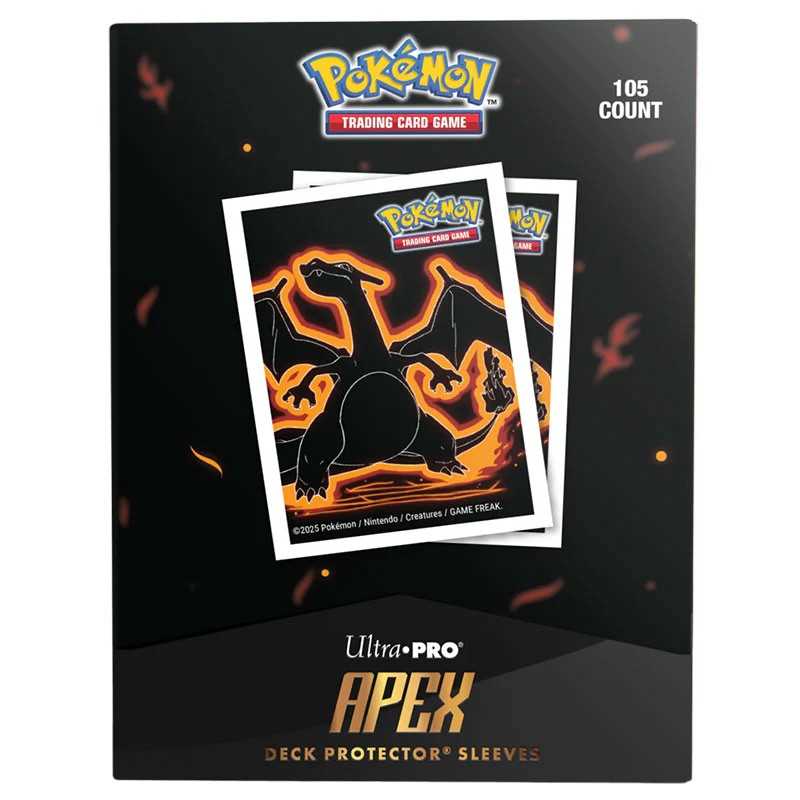The 105ct APEX Deck Protector® Sleeves for the Pokémon Trading Card Game are made with our new easy-shuffle formulation and feature bold artwork of Charizard bursting through a dark background on a textured back. Archival-safe polypropylene materials ensure you can sleeve your cards with confidence, and the gloss clear front allows your foil cards to shine! Sized for standard size trading cards measuring 2.5 in. x 3.5 in.