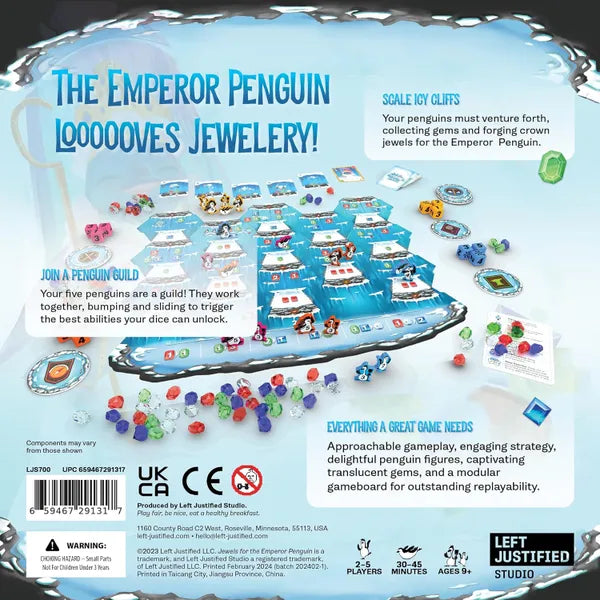 The Emperor Penguin looooves jewellery! In Jewels for the Emperor Penguin, each player takes charge of a five-member penguin guild that must scale the icy walls of the Valley of the Emperor Penguin, gathering gems — emeralds, rubies, sapphires, and diamonds — and making advantageous exchanges to acquire the specific gem-recipes needed to claim objective cards that represent the fantastic jewellery the Emperor Penguin covets.