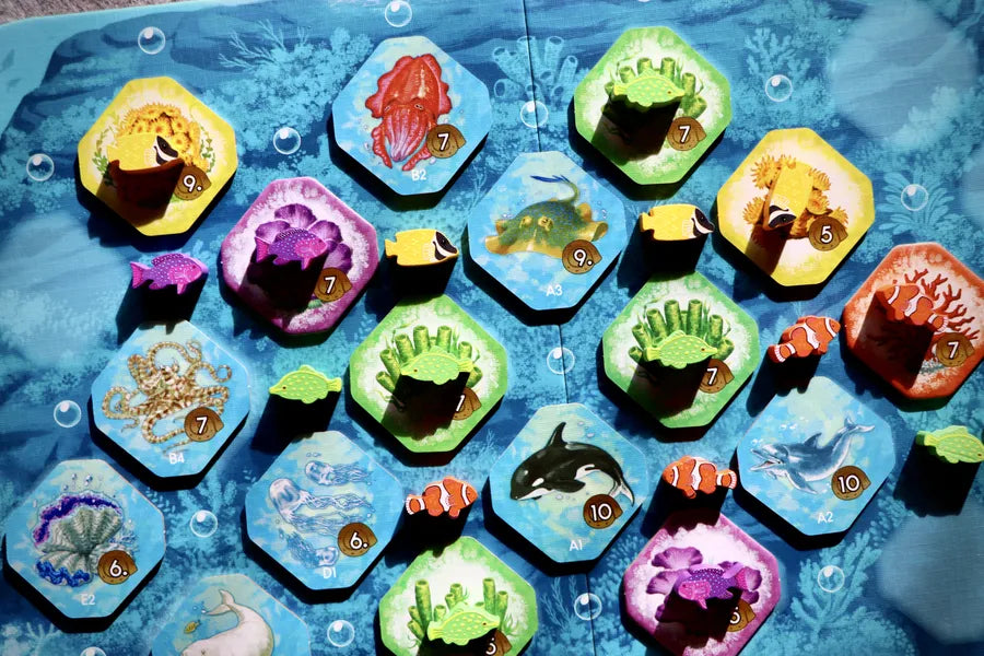 On your turn, choose tiles showing fish, coral, or sea life, and place them on an empty space on your board. When fish surround a coral of the same color, you flip over the completed coral, which becomes a home for fish. Choose which fish will inhabit the coral, keeping the puzzle and ecosystem cards in mind. Use seashells to lure fish and move them, ideally completing multiple coral at once if you build them strategically.